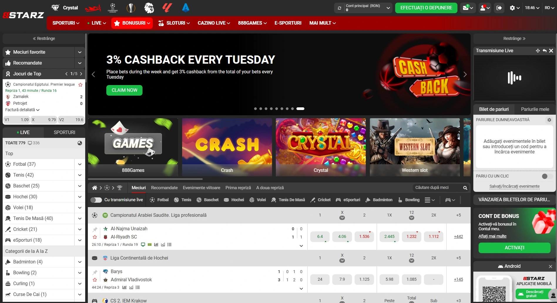 Secțiunea de pariuri sportive e solidă. Au peste 30 de piețe pentru evenimente live, inclusiv unghiuri, cartonașe galbene, lovituri libere. Oferta e activă 24/7, deci găsești mereu ceva de pariat.