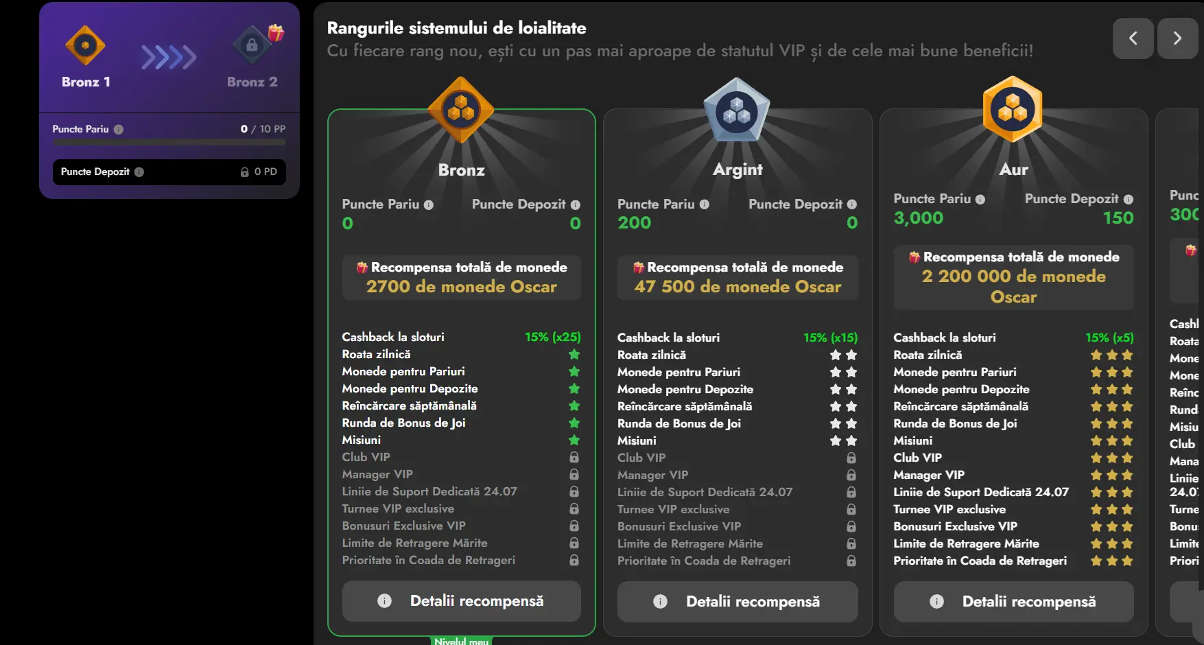 Oscarspin VIP nu e doar despre ranguri mari precum Gold sau Platinum. Fiecare nivel e împărțit în sub-nivele (Bronze 1, Bronze 2, etc.), deci progresul e gradual. La început poate părea lent, mai ales că cerințele pentru Platinum sunt destul de abrupte – 300,000 WP și 15,000 DP nu le faci peste noapte.
